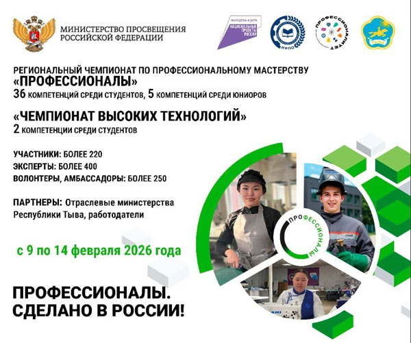 Министерство образования Республики Тыва объявляет о старте региональных этапов Чемпионата по профессиональному мастерству «Профессионалы» и Чемпионата высоких технологий. Соревнования будут проходит с 9 по 14 февраля 2026 года.